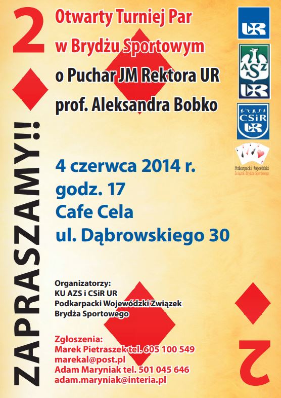 Z okazji święta Uniwersytetu Rzeszowskiego - Centrum Sportu i Rekreacji, Klub Uczelniany AZS, Stowarzyszenie Studentów i Absolwentów UR oraz Podkarpacki Wojewódzki Związek Brydża Sportowego w Rzeszowie organizują:II Otwarty Turniej Par w Brydżu Sportowym o Puchar JM Rektora UR prof. dr hab. Aleksandra Bobko w dniu 4.06.2014 r.o godz.17.00 w Cafe Cela ul. Dąbrowskiego 30